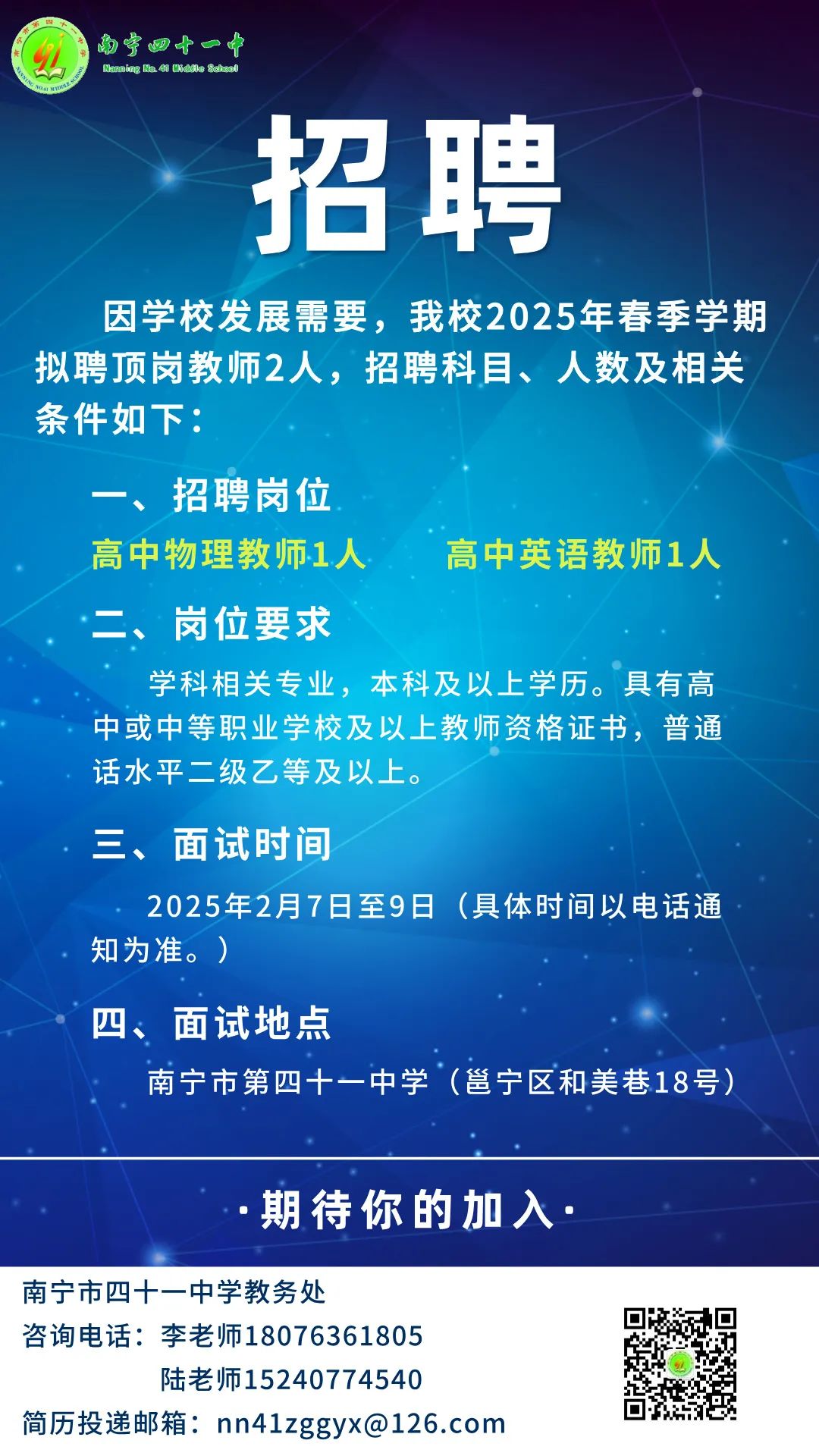 2025年春季學期南寧市第四十一中學關于公開招聘頂崗教師2人