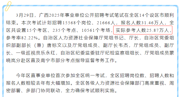 今年廣西事編統(tǒng)考報(bào)名人數(shù)31.46萬人,25.87萬人參考,參考率82.22%