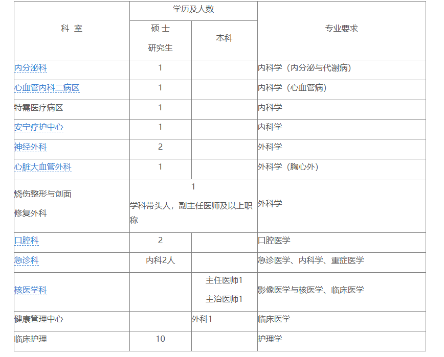 4.臨床醫(yī)師、醫(yī)技人員一般要求35周歲以下,特別優(yōu)秀者可酌情放寬條件;護(hù)理人員要求為應(yīng)屆畢業(yè)生,30周歲以下,碩士研究生及以上學(xué)歷者可放寬年齡條件。