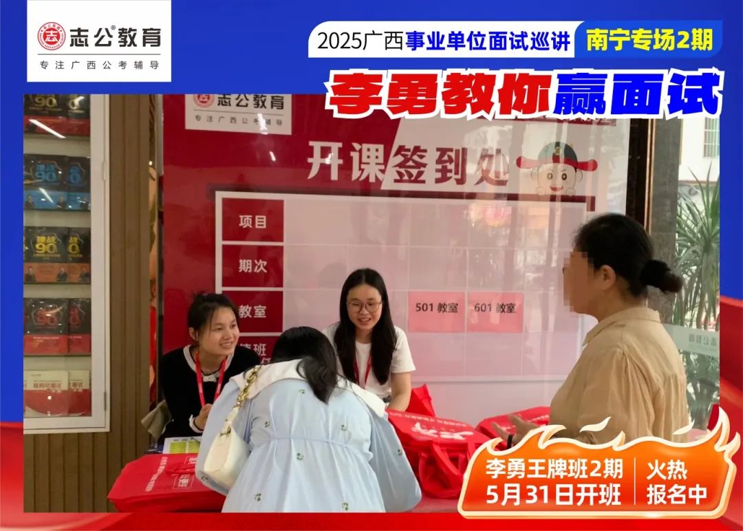 隨著2025廣西事業(yè)單位——李勇教你贏面試【南寧專場(chǎng)2期】線下巡講落幕,這場(chǎng)"面試攻堅(jiān)戰(zhàn)",不僅點(diǎn)燃了備考熱情,更讓志公教育"幫助人才實(shí)現(xiàn)更高質(zhì)量的就業(yè)"的使命,在八桂大地結(jié)出更多碩果。