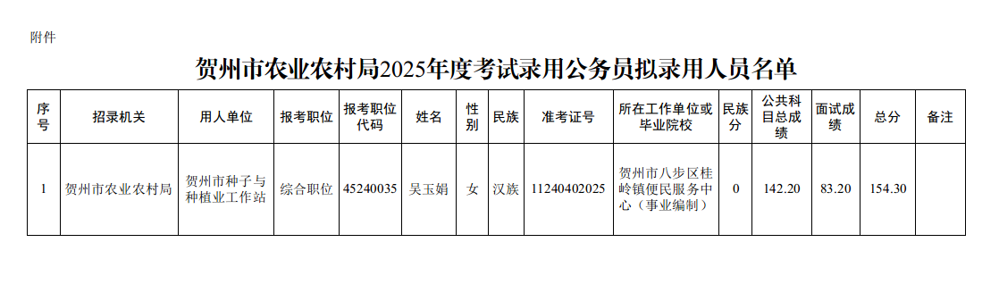 1 賀州市人力資源和社會保障局2025年公開遴選公務(wù)員擬任用人員名單