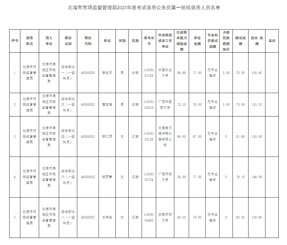 附件:北海市市場監(jiān)督管理局2025年度考試錄用公務(wù)員第一批擬錄用人員名單