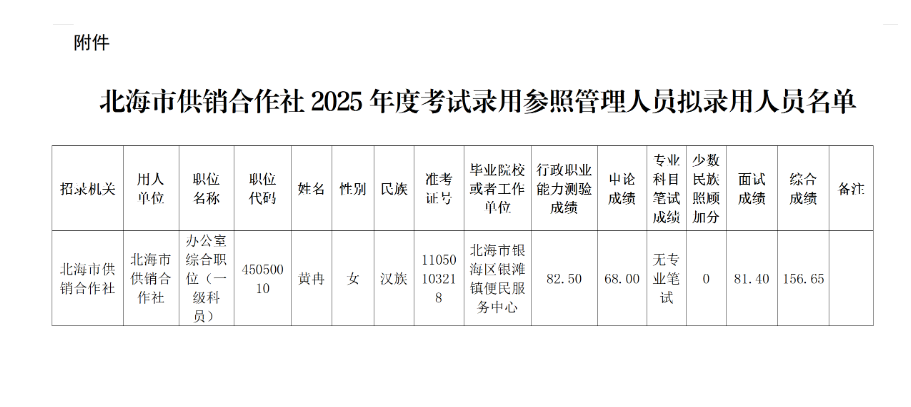 附件:北海市供銷合作社2025年度考試錄用參照管理人員擬錄用人員名單
