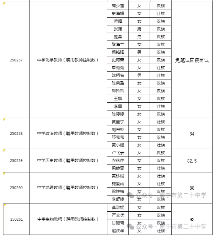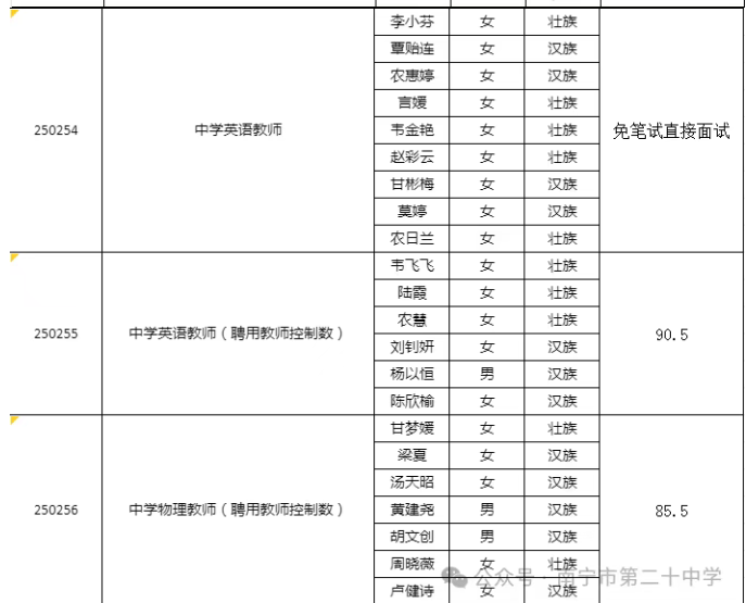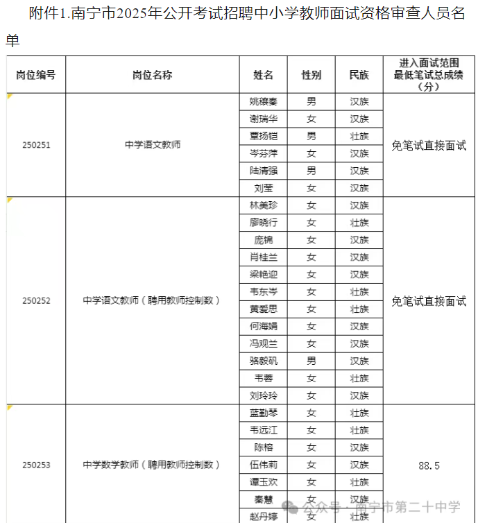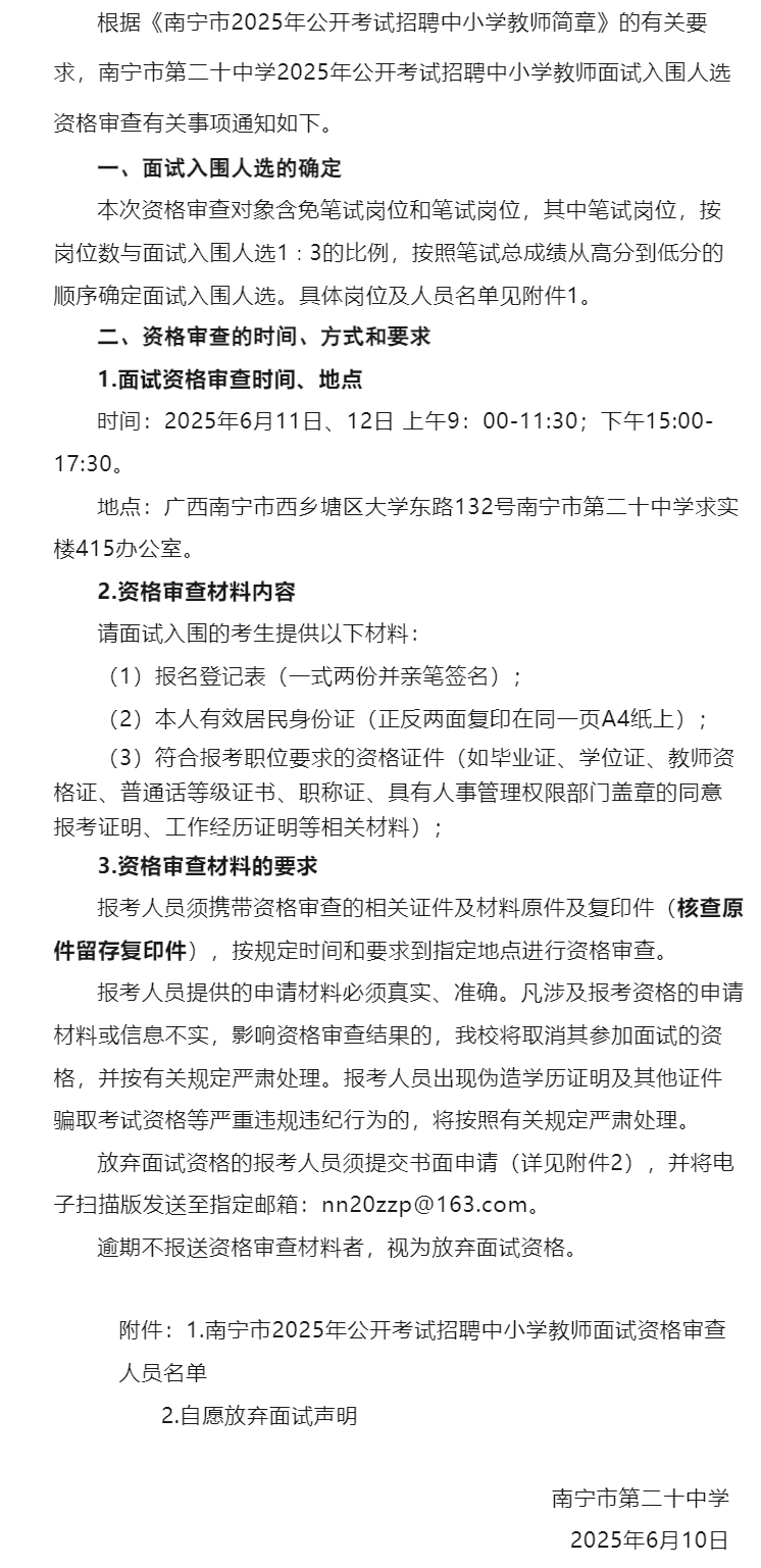 南寧市第二十中學2025年公開考試招聘中小學教師面試入圍人選資格審查通知