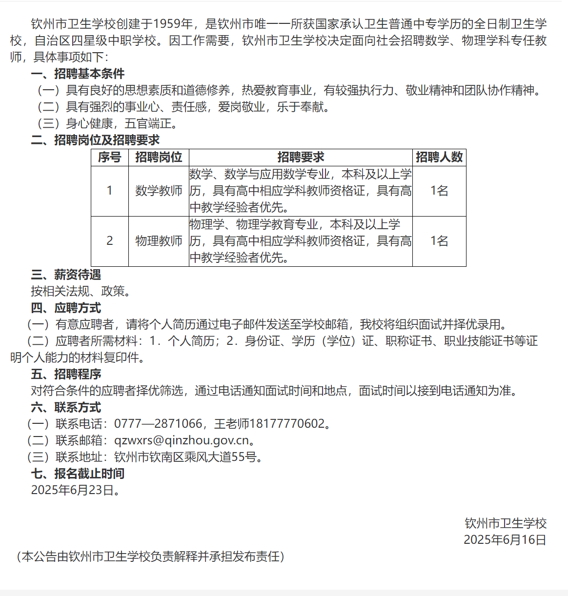 欽州市衛(wèi)生學校2025年公開招聘數(shù)學、物理學科專任教師公告