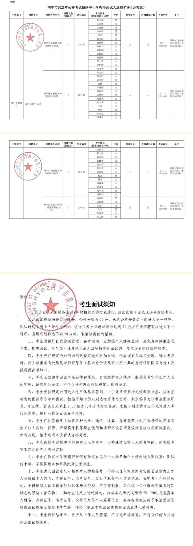 附件:1.南寧市2025年公開(kāi)考試招聘中小學(xué)教師南寧南分市第八中學(xué)面試人選花名冊(cè)