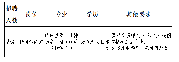 根據(jù)業(yè)務(wù)發(fā)展需要,持續(xù)加強(qiáng)我市心理健康和精神衛(wèi)生服務(wù)能力建設(shè),更好地滿足我市廣大人民群眾看病就醫(yī)需求,我院特面向社會(huì)公開招聘數(shù)名編制外聘用工作人員,現(xiàn)將有關(guān)事項(xiàng)公告如下:
