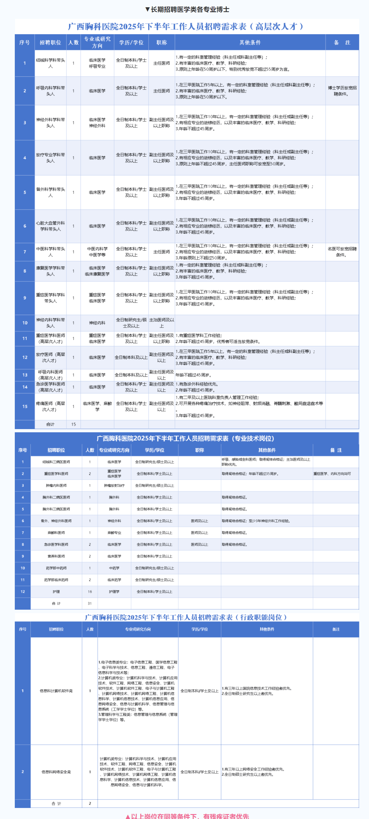 2.網(wǎng)上報(bào)名:請(qǐng)將招聘報(bào)名表及個(gè)人信息匯總表(詳見(jiàn)附件)、個(gè)人簡(jiǎn)歷、身份證、學(xué)歷學(xué)位證、大學(xué)英語(yǔ)四六級(jí)考試成績(jī)報(bào)告單、在校期間成績(jī)單、資格證、執(zhí)業(yè)證、住院醫(yī)師規(guī)范化培訓(xùn)合格證、獲獎(jiǎng)證書(shū)電子版打包發(fā)送到廣西壯族自治區(qū)胸科醫(yī)院人事科郵箱gxltyyrsk@126.com。郵件統(tǒng)一命名格式為“崗位+學(xué)歷+姓名”,例如:“呼吸內(nèi)科醫(yī)師+全日制本科+姓名”。