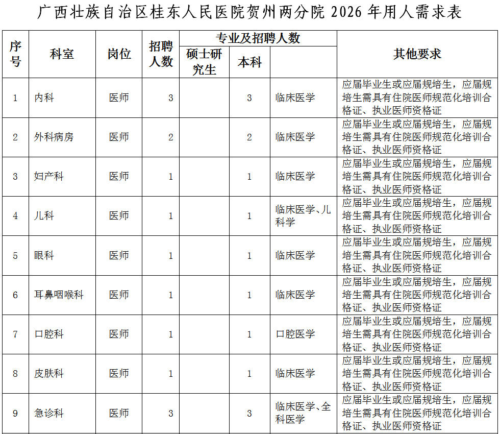 (應(yīng)聘報(bào)名二維碼)同時(shí),按以下要求提供個(gè)人應(yīng)聘材料(電子版)發(fā)電子郵箱:gdyy2817726@163.com(郵件主題請(qǐng)標(biāo)明:“姓名+賀州兩分院”字樣)。應(yīng)屆畢業(yè)生:個(gè)人簡(jiǎn)歷、身份證、就業(yè)推薦表、成績(jī)單、各種獎(jiǎng)項(xiàng)獎(jiǎng)勵(lì)證書(shū)、外語(yǔ)等級(jí)證書(shū)等。非應(yīng)屆畢業(yè)生:個(gè)人簡(jiǎn)歷、身份證、畢業(yè)證、畢業(yè)證備案登記表、學(xué)位證、學(xué)位證備案登記表、職稱(chēng)證、執(zhí)業(yè)證、住院醫(yī)師規(guī)范化培訓(xùn)合格證、工作證明等。報(bào)名時(shí)所提交的申請(qǐng)材料必須真實(shí)、準(zhǔn)確,因報(bào)名時(shí)提交的申請(qǐng)材料不真實(shí)、不完整或錯(cuò)誤填寫(xiě)報(bào)名信息,造成資格審查、面試資格審查不通過(guò)的,后果由報(bào)名人員自行承擔(dān)。(2)資格審核。人事科依據(jù)招聘公告和用人需求規(guī)定的資格條件對(duì)應(yīng)聘人員簡(jiǎn)歷進(jìn)行收集和資格初步審查,經(jīng)招聘工作領(lǐng)導(dǎo)小組審核后,確定符合崗位條件報(bào)名人員名單,由醫(yī)院人事科電話或短信通知符合條件人員。(3)考核??己斯P試和面試由人事科負(fù)責(zé)組織實(shí)施,協(xié)助部門(mén)為醫(yī)務(wù)部、護(hù)理部、科教科以及用人科室,紀(jì)律監(jiān)督部門(mén)為監(jiān)察室。逾期未參加則視為自愿放棄。(4)試工。通過(guò)考核的非應(yīng)屆畢業(yè)應(yīng)聘人員,須到醫(yī)院試工5天。試工不通過(guò),不予聘用。(5)體檢。體檢工作由廣西壯族自治區(qū)桂東人民醫(yī)院按照有關(guān)規(guī)定統(tǒng)一組織。體檢標(biāo)準(zhǔn)參照《廣西壯族自治區(qū)事業(yè)單位公開(kāi)招聘人員體檢通用標(biāo)準(zhǔn)(試行)》《廣西壯族自治區(qū)事業(yè)單位公開(kāi)招聘人員體檢操作手冊(cè)(試行)》執(zhí)行。體檢不合格或隱瞞真實(shí)情況致使體檢結(jié)果失真的,不予聘用。因體檢不合格空缺崗位的,將按考核的綜合成績(jī),從高到低,順位補(bǔ)充體檢人員。(6)公示和聘用。對(duì)擬聘非應(yīng)屆畢業(yè)應(yīng)聘者在全院范圍內(nèi)進(jìn)行公示,公示期為5個(gè)工作日,公示期滿(mǎn)無(wú)異議按程序辦理聘用手續(xù)。對(duì)公示有異議,經(jīng)核實(shí)影響聘用的,取消其聘用資格;對(duì)反映問(wèn)題難以核實(shí)的暫緩聘用,待核實(shí)清楚后按有關(guān)規(guī)定辦理。