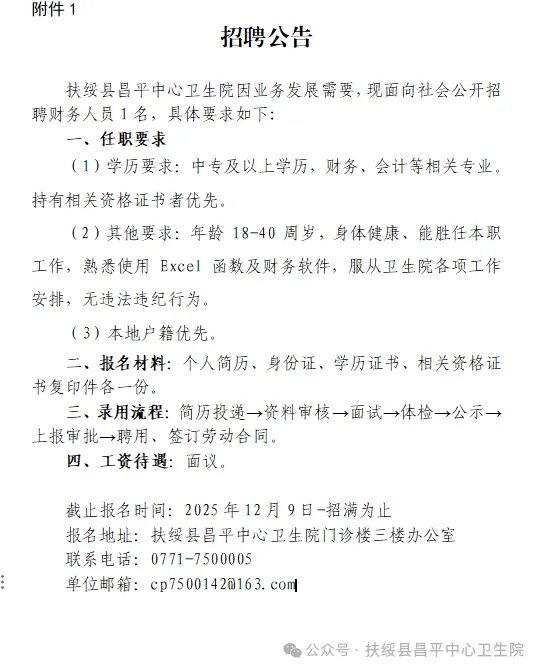 原文標題:2025年崇左扶綏縣昌平中心衛(wèi)生院公開招聘財務工作人員1人