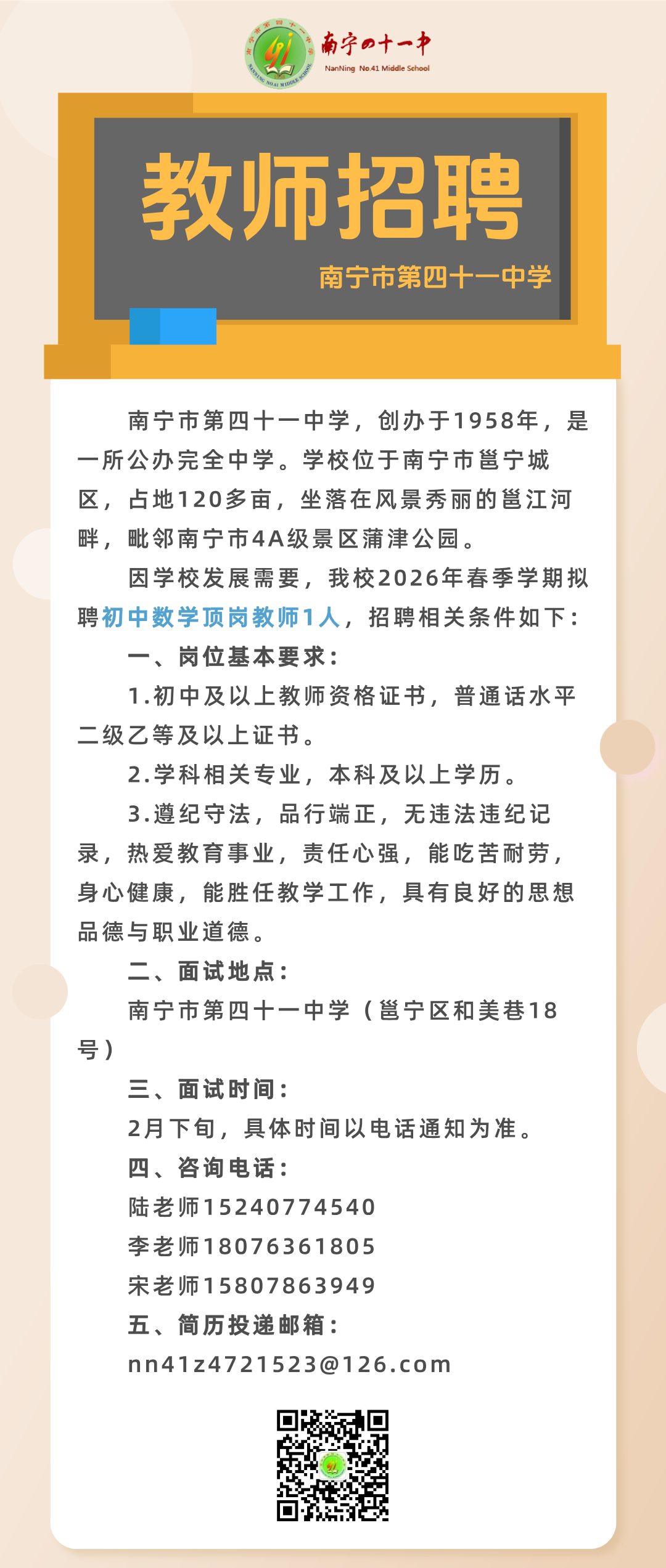 原文標題:2026年春季學期南寧市第四十一中學關(guān)于公開招聘頂崗教師的啟事